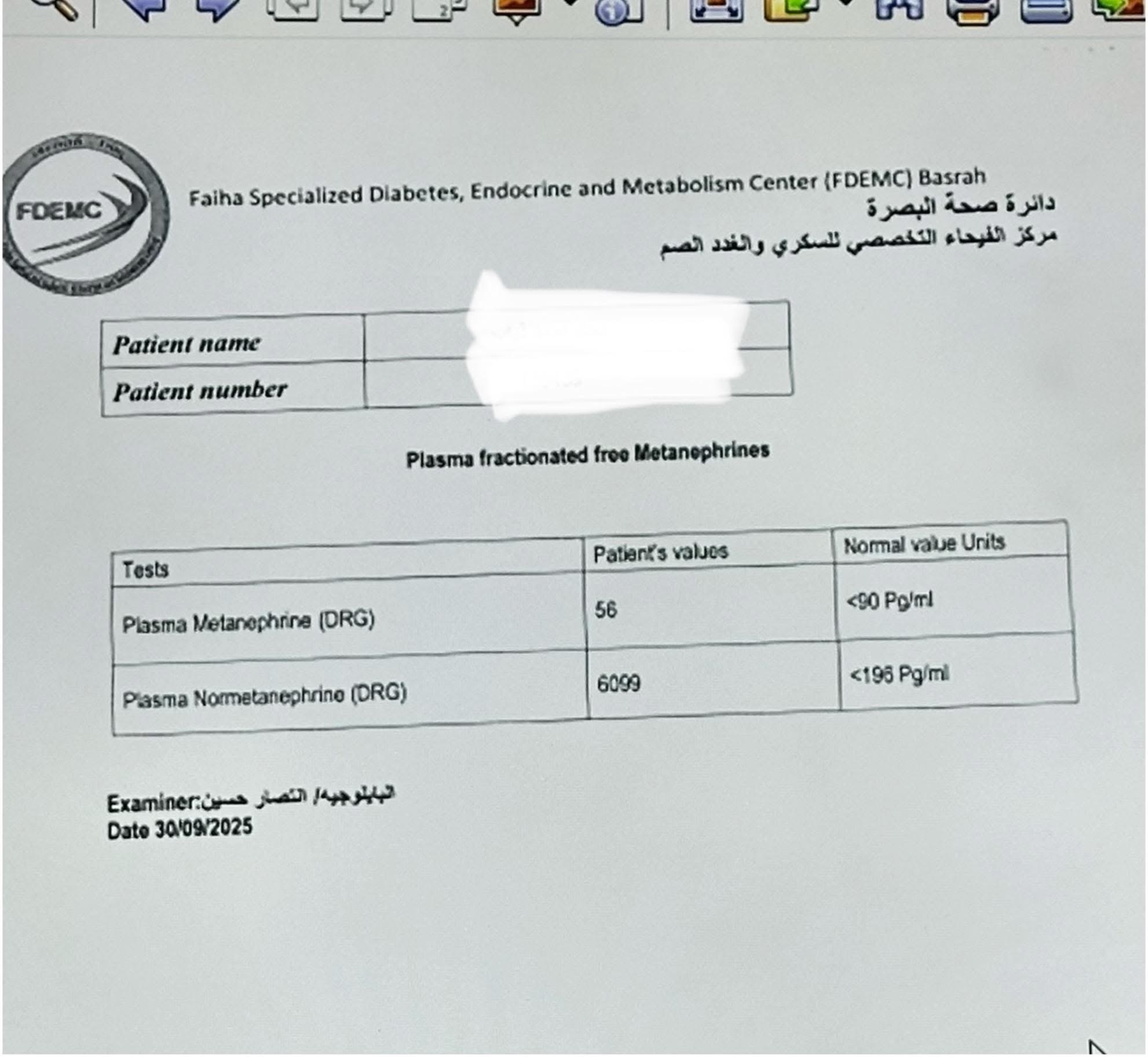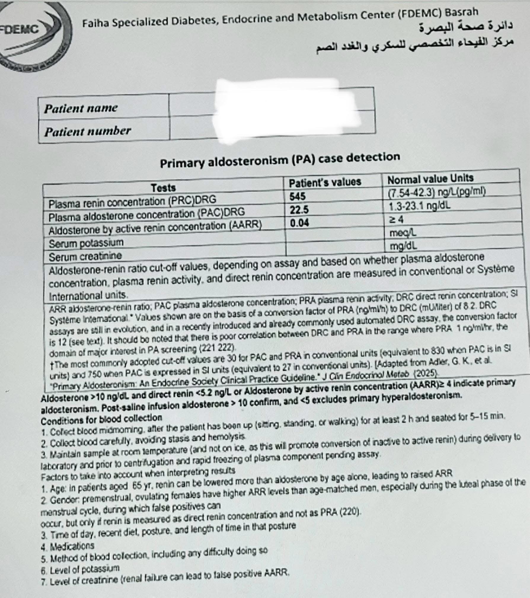 المريض، البالغ من العمر ٢٥ عامًا ومن سكنة محافظة نينوى / الموصل، أُحيل إلى مركز الفيحاء التخصصي بعد معاناة طويلة من ارتفاع شديد في ضغط الدم وتسارع حاد في ضربات القلب. وبعد إجراء الفحوصات اللازمة، تبيّن وجود ورم كبير في الغدة الكظرية اليمنى، يفرز كميات مرتفعة جدًا من هرمون الأدرينالين (Pheochromocytoma)، ما شكّل خطرًا كبيرًا على حياته. كما أظهرت الفحوصات أن الورم كان مخترقًا من الأوعية الدموية الرئيسية، مما زاد من تعقيد وخطورة التداخل الجراحي.