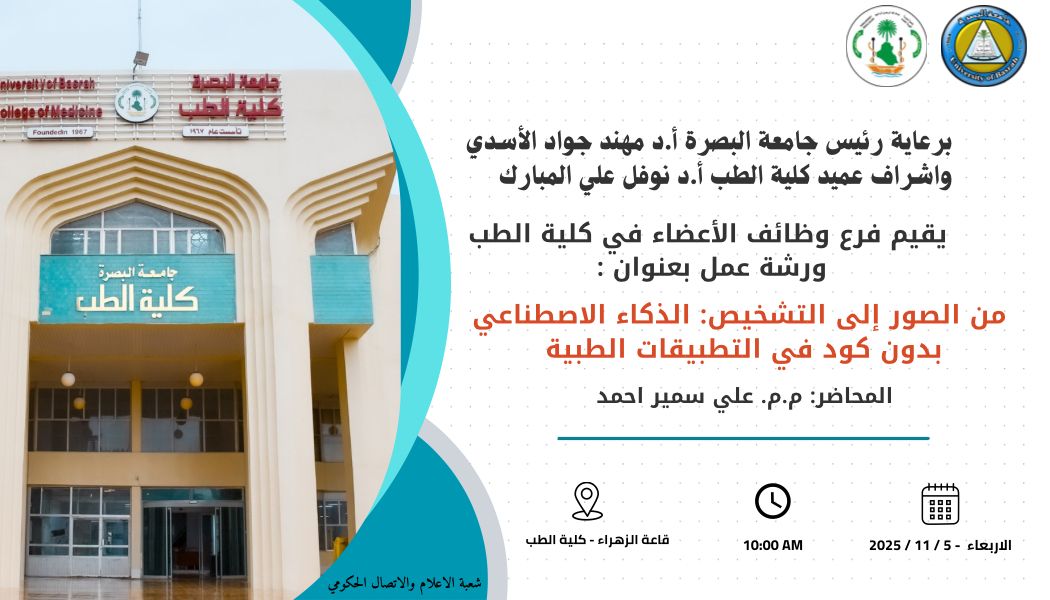 سيقيم فرع وظائف الاعضاء في كلية الطب بجامعة البصرة ورشة عمل بعنوان : من الصور الى التشخيص الذكاء الاصطناعي بدون كود في التطبيقات الطبية.
