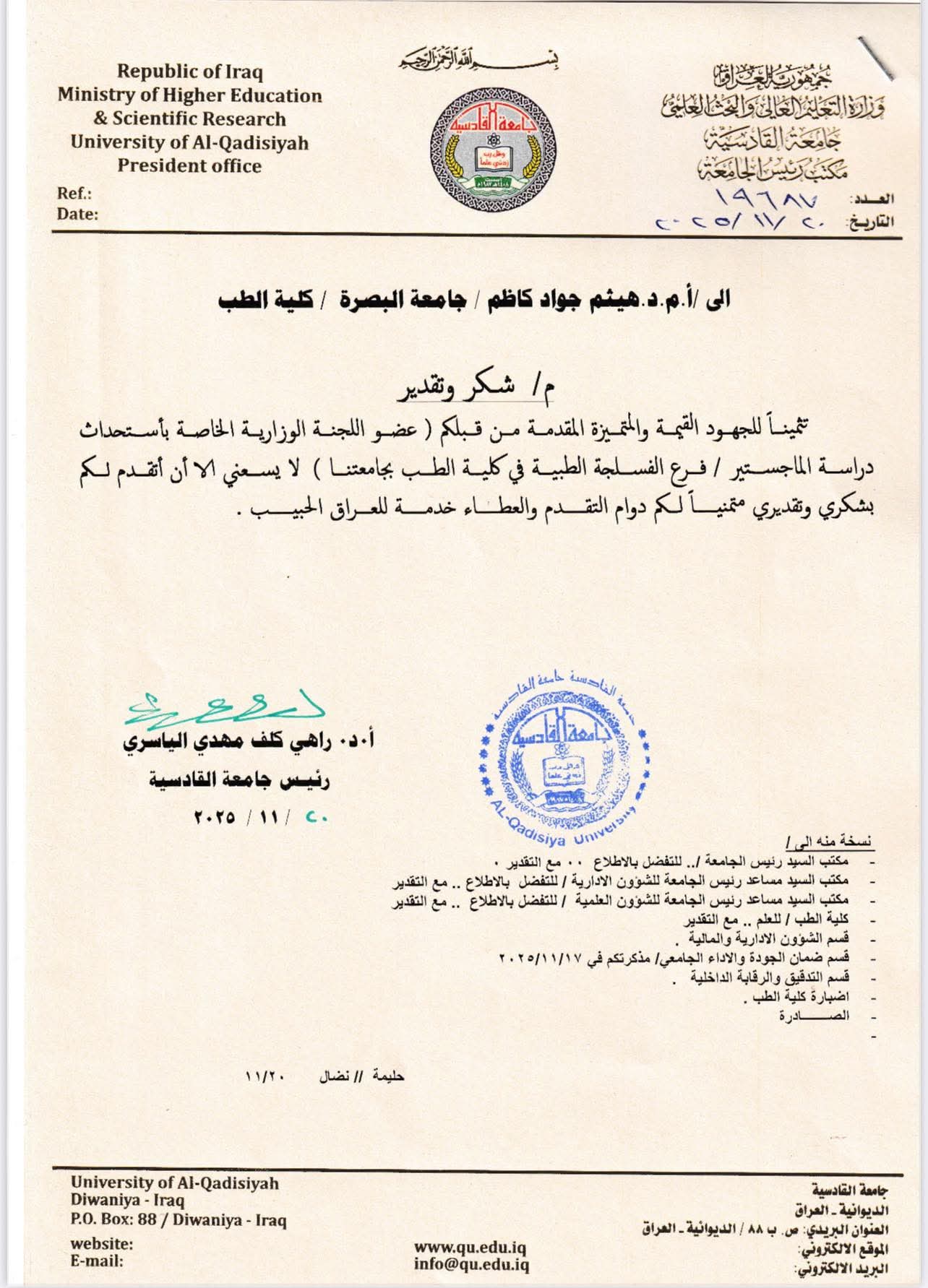 حصل التدريسي في كلية الطب بجامعة البصرة الاستاذ المساعد الدكتور هيثم جواد كاظم على كتاب شكر وتقدير من رئيس جامعة القادسية تثميًا لجهوده القيمة والمتميزة لمشاركته في اللجنة الوزارية الخاصة باستحداث دراسة الماجستير بالفسلجة الطبية في كلية الطب / جامعة القادسية متمنيًا له دوام التقدم والعطاء لخدمة العراق الحبيب.